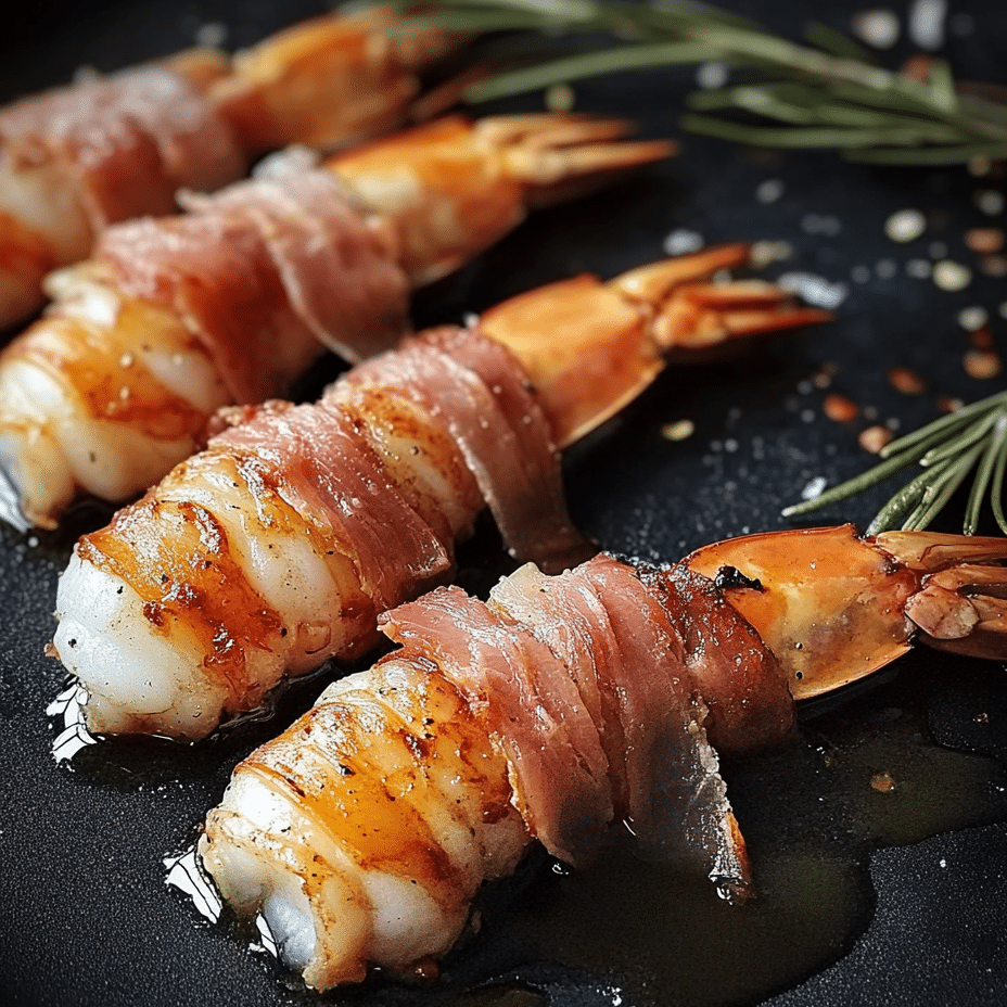 Scalda un filo d’olio in una padella con l’aglio. Cuoci i gamberi avvolti per 2–3 minuti per lato, finché il lardo sarà croccante.